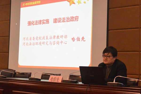 培訓(xùn)班為期半天,邀請(qǐng)河北省委黨校哈伯先教授作了題為“強(qiáng)化法律實(shí)施、建設(shè)法治政府”的講座,詳細(xì)介紹了法治、法治政府與依法治國(guó)的內(nèi)涵、價(jià)值與現(xiàn)狀,講解了新修訂行政訴訟法以及河北省行政機(jī)關(guān)應(yīng)訴辦法。大家普遍認(rèn)為,本次培訓(xùn)主題集中,內(nèi)容豐富,務(wù)實(shí)管用,收獲很大。