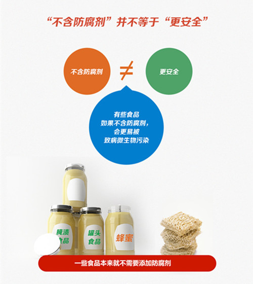 “保質(zhì)期長=防腐劑多”、“防腐劑多=不安全”、“純天然=安全”類似這樣的公式固化于很多消費(fèi)者的心里,一般消費(fèi)者對“不含防腐劑”、“純天然”、“零添加”的理解就是更安全,而商家也瞄準(zhǔn)了這一點(diǎn),市場上以“不含防腐劑”為宣傳的食品越來越多。