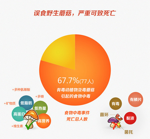 據(jù)統(tǒng)計(jì),2014年有毒動植物及毒蘑菇引起的食物中毒事件死亡人數(shù)最多(77人),占食物中毒事件死亡總?cè)藬?shù)的70.0%。專家指出,鑒別野生蘑菇是否有毒需要專業(yè)機(jī)構(gòu)和人員幫助,目前沒有簡單易行的鑒別方法,民間流傳的辨別方法經(jīng)證實(shí)并不可靠,預(yù)防毒蘑菇中毒的根本辦法就是不要采食野生蘑菇。一旦食用野生蘑菇后出現(xiàn)中毒癥狀,要立即催吐,并盡快就醫(yī)。