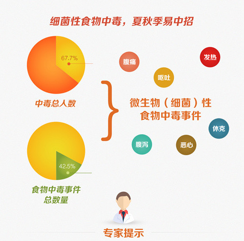 在氣溫較高的夏秋季,人們?nèi)绻粤诉^夜的飯菜或是不新鮮的海鮮,很可能出現(xiàn)惡心、嘔吐、腹痛、腹瀉、發(fā)熱、休克等癥狀。這是因?yàn)闈駸岬奶鞖庥欣诩?xì)菌的滋生,致病菌一旦污染食品,在很短時(shí)間內(nèi)就可迅速繁殖至可致病的數(shù)量。不可小看這些肉眼看不到的細(xì)菌,它們釋放出來的毒素即使經(jīng)高溫處理也不會被破壞,人食入后仍可發(fā)生中毒。