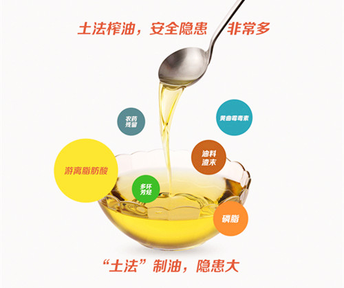 專家指出,事實(shí)上,經(jīng)過“土法”榨得的油中含有很多其他成分,如游離脂肪酸、磷脂、油料渣,以及在種植、收獲、晾曬、儲藏等環(huán)節(jié)可能帶入的多環(huán)芳烴、黃曲霉毒素及農(nóng)藥殘留。這樣的油如果不經(jīng)過精煉的過程,其本身不穩(wěn)定,易于被氧化、變質(zhì),而且多環(huán)芳烴、黃曲霉毒素和農(nóng)藥殘留都是對人體健康危害極大的物質(zhì)。因此,“土法榨油”比工廠生產(chǎn)的壓榨油安全隱患更大。
