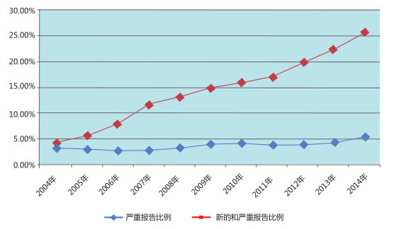 圖3 2004-2014 年新的和嚴重以及嚴重藥品不良反應/事件報告比例