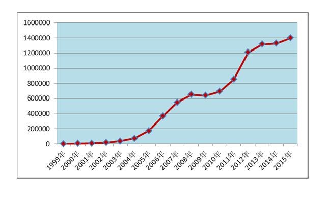 圖1 1999年-2015年全國(guó)藥品不良反應(yīng)/事件報(bào)告數(shù)量增長(zhǎng)趨勢(shì)
