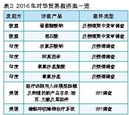 2016年,我國醫藥產品共遭遇8起國外貿易救濟案,涉案產品不僅包含葡萄糖酸鈉、酒石酸、雙氯芬酸鈉、阿莫西林、氧氟沙星羧酸、氧氟沙星等優勢原料藥,也涉及醫療訓練用人體模型器械、睡眠呼吸障礙治療系統等我國日益強大的醫療器械領域(見表3)。面對貿易救濟案件數目的增加,中國醫藥保健品進出口商會會同相關企業積極應對并取得成效,如2016年歐盟對華酒石酸反傾銷案的應訴,是惟一經過兩次日落復審和多次期中復審仍舊保持零稅率的案例。該案例已成為應對歐盟貿易救濟案件的經典案例。(實習記者 落楠)