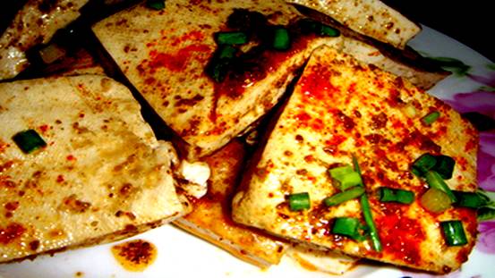 將豆腐切成大小適中的塊狀,放入事先燒制好的植物灰(主要以辣椒枯干、大豆桿、紅苕葉桿、桐子殼等燒制混合)中趁熱裹拌,取出后在自然環境中靜置。3—5天后,將豆腐塊表面的植物灰洗盡,切成薄片,蘸上油酥或直接放入鍋中煮食。再配以本地毛白菜、青菜、洋芋等與豬血旺,蘸上少許糊辣椒,口感純正,香嫩甜滑,令人回味無窮。