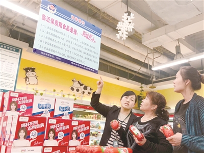 圖為4月25日酒泉市北京華聯超市的工作人員正在向消費者仔細講解“臨近保質期食品銷售專區”內食品挑選、購買知識/攝影 王依依
