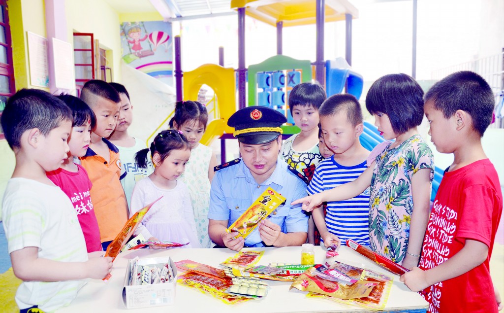 圖為5月28日,監管人員在于都縣向仙下鄉小精靈幼兒園小朋友講解食品知識。/攝 王雨林
