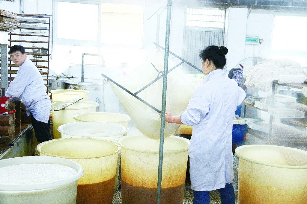 午后,正是豆腐作坊工人們最忙碌的時候。一進入寬敞明亮的廠房,撲面而來的豆腐香氣似乎在歡迎來客,放眼望去,一家挨著一家的豆腐作坊整齊排列在眼前。轟鳴的機器聲中,工人們有的在磨黃豆,有的在過濾豆?jié){,忙碌而井然有序。