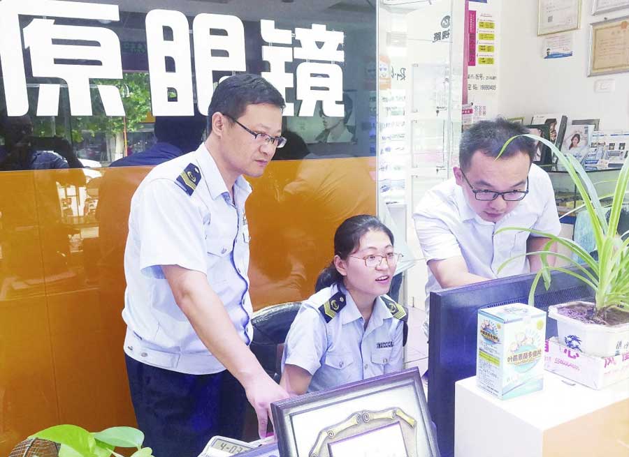 檢查人員正在調取濟南市長清區中原眼鏡店經營的隱形眼鏡的相關記錄