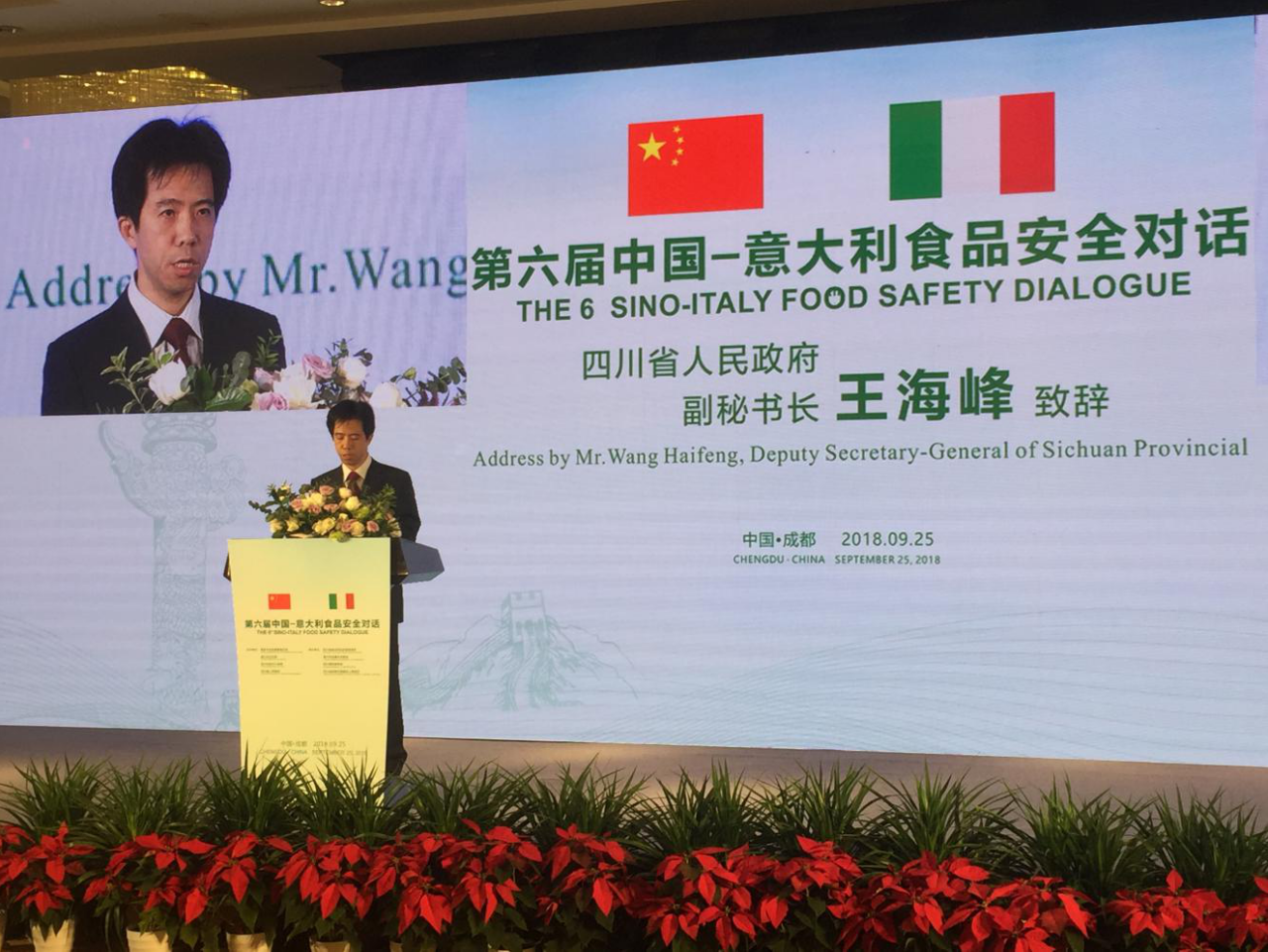 9月25日,第六屆中國—意大利食品安全對話在成都舉行。來自中國、意大利兩國政府領導、企業嘉賓、專家學者共聚蓉城,圍繞“食品領域風險評估和防控”主題,共話食品安全,共謀發展大計。意大利駐華大使謝國誼、國家市場監督管理總局副局長孫梅君、四川省人民政府副秘書長王海峰等出席活動并致辭,四川省食品藥品監督管理局黨組書記、局長鞠波主持活動。