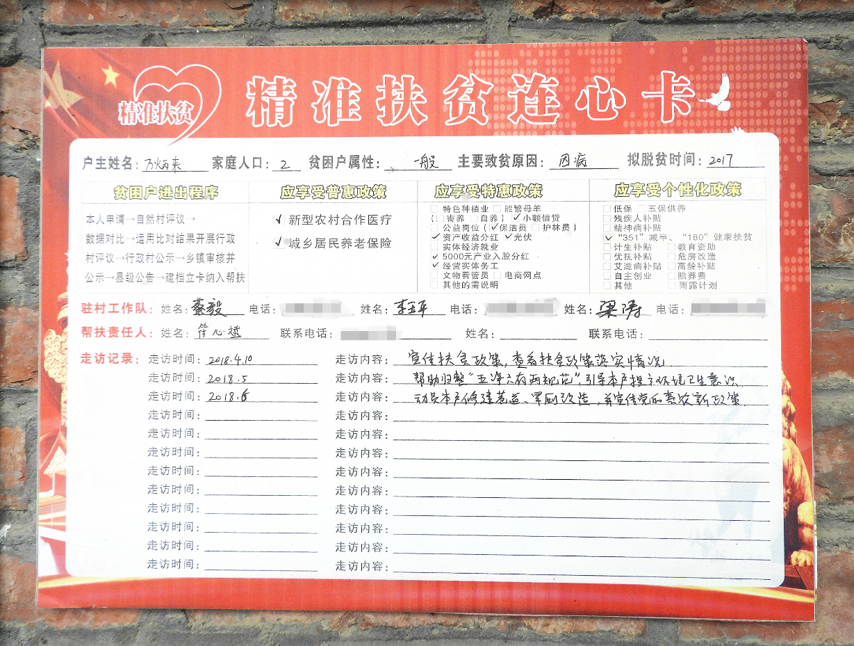 圖為萬炳來家堂屋外墻顯眼處張貼的“精準扶貧連心卡”。
