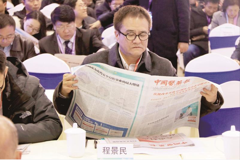 12月19日上午,2018智慧食藥研討會現場,與會嘉賓正在閱讀當日的《中國醫藥報》。本報記者郭厚杰攝
