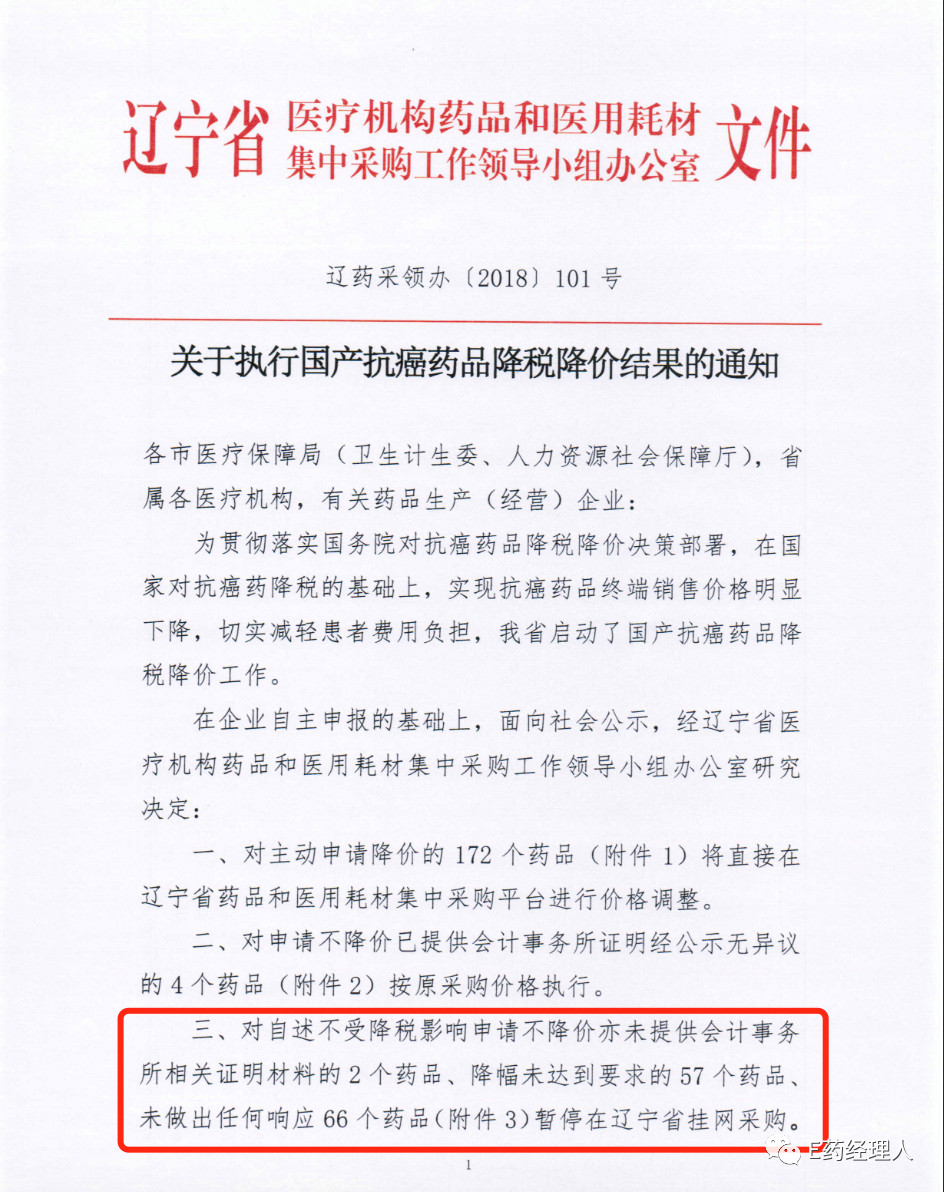 具體的降價原則是,對于已在遼寧省掛網采購的抗癌藥品,由藥品生產企業在規定時限內,按照不高于已經完成降稅降價的全國其他各省最低價的原則,通過承諾申報、調查核實、社會公示的方法進行調整。而未在遼寧掛網采購的,則開辟綠色通道,但“降稅降價”,是參與遼寧省掛網采購的準入條件。