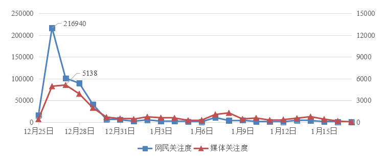 從輿情走勢(shì)來(lái)看,以2018年12月25日~2019年1月17日為監(jiān)測(cè)時(shí)間段,如圖1所示,輿情整體呈現(xiàn)“山峰式”特征,網(wǎng)民表現(xiàn)出較高關(guān)注度。微博占比超過(guò)九成。