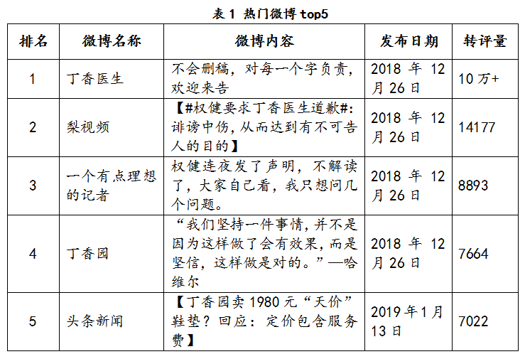 以2018年12月25日~2019年1月17日為監(jiān)測(cè)時(shí)間段,微博平臺(tái)上,丁香醫(yī)生、權(quán)健的聲明等成為主要關(guān)注點(diǎn)。按轉(zhuǎn)評(píng)量排序,熱門(mén)微博如表1所示。