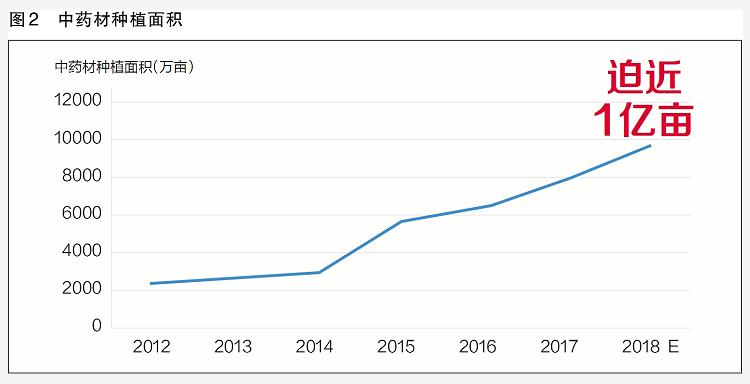 經(jīng)過30多年的發(fā)展,我國藥材種植生產(chǎn)初步完成集約化、規(guī)模化,南北藥材區(qū)劃基本形成。當(dāng)前,全國中藥材種植面積已接近1億畝(見圖2),藥材供給大大超出了需求,但因其質(zhì)量千差萬別,導(dǎo)致部分優(yōu)質(zhì)品種往往供不應(yīng)求。