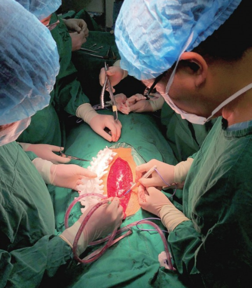 圖為應(yīng)用3D打印脊柱模型輔助脊柱矯形手術(shù)。國(guó)家增材制造創(chuàng)新中心供圖