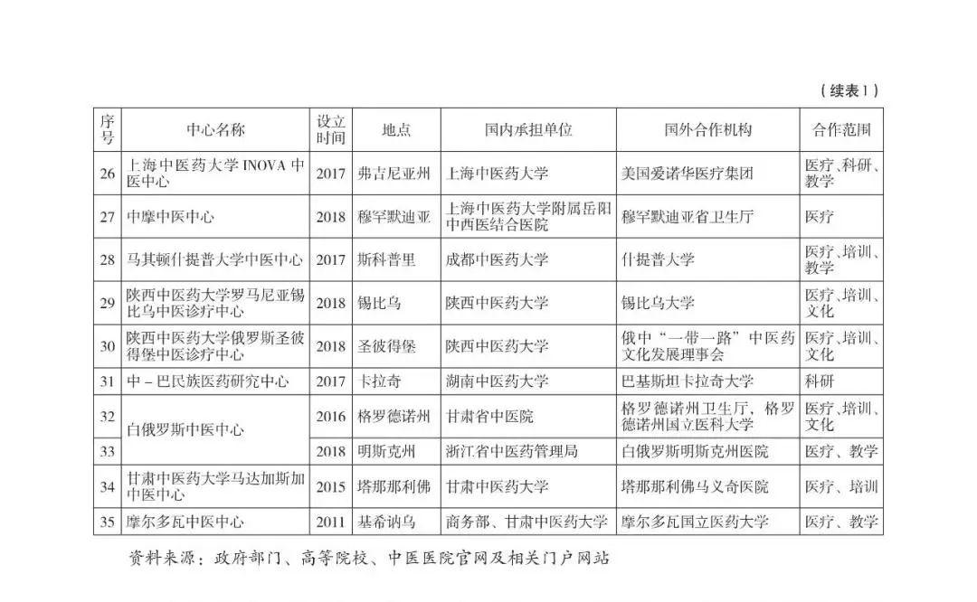 2016 年 12 月出臺的《中醫藥“一帶一路”發展規劃(2016-2020 年)》,明確提出沿中蒙俄、中國 - 中亞 - 西亞、中國 - 中南半島、新亞歐大陸橋、中巴、孟中印緬等國際經濟合作走廊,在中亞、西亞、南亞、東南亞、中東歐、歐洲、大洋洲、非洲等區域建設 30 個中醫藥海外中心。從上表所列中醫藥海外中心的地域分布來看,超過半數集中在中東歐和歐洲,其后為亞洲、非洲、北美洲、大洋洲。其中,中亞、西亞、東南亞、南亞各有 1 ~ 2 個中醫藥海外中心分布。