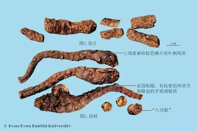 性狀鑒別:本品呈圓柱形,略彎曲,偶有分枝,長(zhǎng)3~12cm,直徑0.3~1cm。表面灰棕色至暗棕色,粗糙,有較密的環(huán)狀節(jié),具稍隆起的芽痕或根痕,上端密被暗棕色鱗片狀的葉柄殘基。體輕,質(zhì)硬而脆,易折斷,斷面略平坦,淡棕色至暗棕色,木部有4~10個(gè)類白色點(diǎn)狀維管束排列成環(huán)。氣微,味極苦。