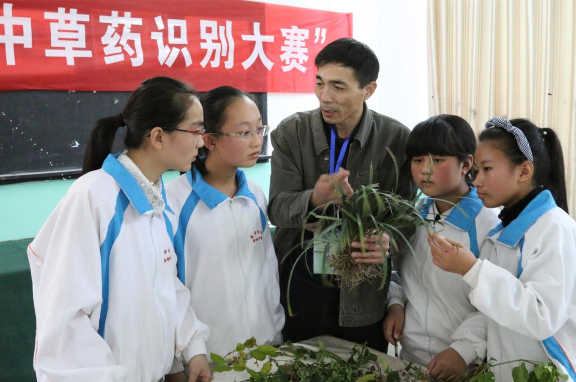 云臺中學(xué)鄉(xiāng)土中草藥識別大賽,吳舟在給同學(xué)們作輔導(dǎo)。