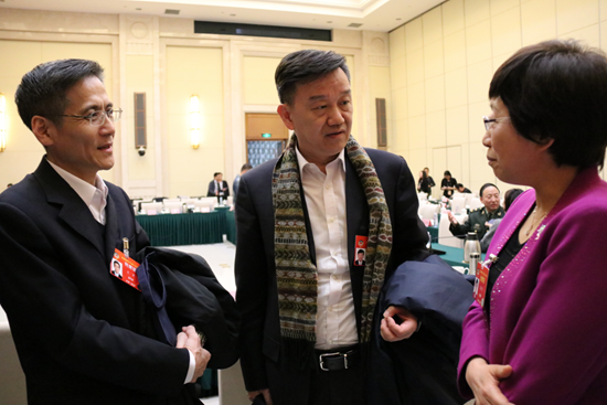 3月7日,全國政協十三屆二次會議醫藥衛生界別聯組會議舉行。列席會議的國家藥監局藥品注冊司司長王平(左)、國家藥監局藥品監管司司長袁林(中)在會議現場與全國政協委員、中國食品藥品檢定研究院標準物質與標準化管理中心主任肖新月(右)交流。(中國食品藥品網記者陸悅 攝)
