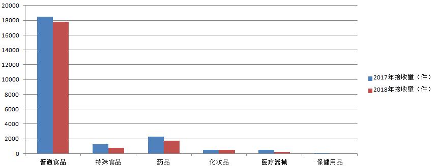 投訴舉報信息從地區分布情況來看,接收最多的地區是西安市(9364件),占投訴舉報信息總量的44.2%;其次為陜西省藥監局投訴舉報大廳(3324件),占總量的15.7%。從產品種類來看,普通食品17798件,占84.1%;藥品、特殊食品、化妝品、醫療器械、保健用品,分別占8.3%、3.7%、2.4%、1.3%、0.3%。與2017年相比,除化妝品外,其余的普通食品、特殊食品、保健用品、藥品和醫療器械投訴舉報信息總量均有所下降。