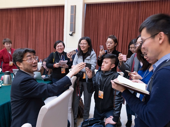 我背著相機在現(xiàn)場抓拍精彩鏡頭,嘗試著用手機為代表委員們錄采訪視頻。經(jīng)常有政協(xié)委員們聊著聊著,一回頭,發(fā)現(xiàn)我在默默地“偷拍”他們,于是高興地讓我為他們拍攝合影。自然,這一招讓我拿到了不少委員的微信。