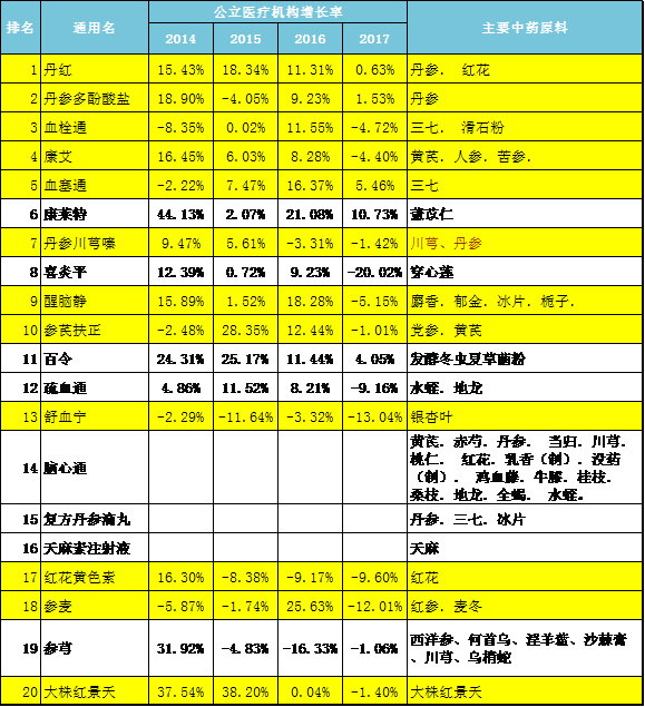 如表3,在國內(nèi)公立醫(yī)療機(jī)構(gòu)銷量前20位品種中,描黃色的是已被納入輔助用藥并重點(diǎn)監(jiān)控的品種,基本都是在醫(yī)療機(jī)構(gòu)銷售占比過高的中藥注射劑。被重點(diǎn)監(jiān)控后,其臨床銷售量預(yù)計(jì)會(huì)出現(xiàn)較大幅度下滑,從而影響到丹參、紅花、三七、人參等熱點(diǎn)中藥材的需求量。