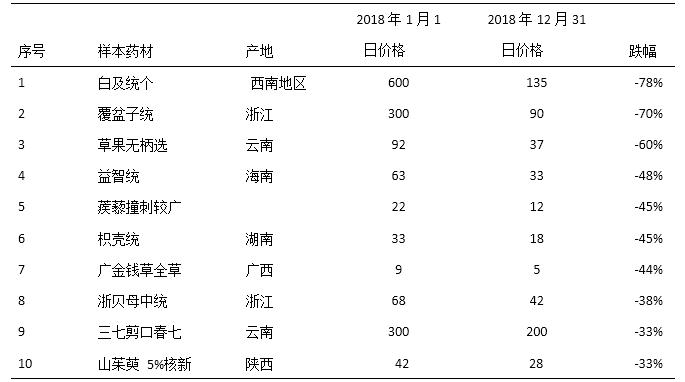 表2 2018年中藥材價(jià)格綜合200指數(shù)構(gòu)成品種跌幅前10位(中藥材天地網(wǎng))