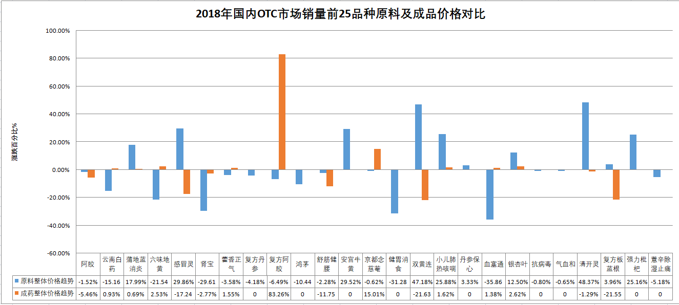 通過對(duì)2018年國內(nèi)OTC市場(chǎng)銷售前25位中成藥品種的原料及產(chǎn)品價(jià)格分析發(fā)現(xiàn),過去一年,25個(gè)樣本的中藥投料平均漲幅只有2.98%,除了金銀花、苦地丁等原藥材漲價(jià)因素外;還有人工牛黃、人工冰片、薄荷腦、熊云氧膽酸等中藥工業(yè)品漲價(jià)所致。