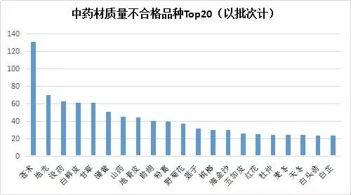 圖14 2018年,抽檢中藥材質(zhì)量不合格品種前20位(根據(jù)國家藥監(jiān)局發(fā)布數(shù)據(jù)整理)