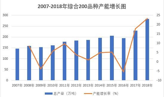 圖6 2007-2018年,綜合200品種產(chǎn)能增長(zhǎng)示意圖(天地云圖大數(shù)據(jù))
