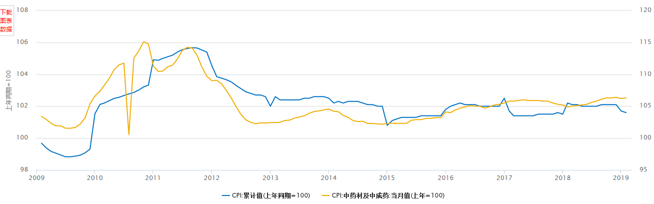 圖4 2009年-2018年國內(nèi)中藥材及中成藥CPI指數(shù)運(yùn)行(國家統(tǒng)計(jì)局發(fā)布)