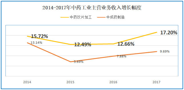 圖8 2014-2017年,中藥工業(yè)主營收入增長(zhǎng)幅度(國家工信部發(fā)布)