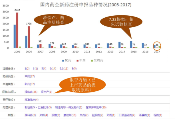 圖15 2005-2017年,國內(nèi)新藥注冊(cè)申報(bào)情況統(tǒng)計(jì)(根據(jù)原國家食藥監(jiān)總局發(fā)布數(shù)據(jù)整理)