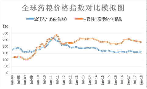 我們通過多項(xiàng)指數(shù)模擬,發(fā)現(xiàn)反映國內(nèi)中藥材市場(chǎng)行情運(yùn)行的中藥材天地網(wǎng)綜合200指數(shù)(以下簡(jiǎn)稱綜合200指數(shù))運(yùn)行,與全球糧價(jià)緊密關(guān)聯(lián)。通過等比例縮放,二者保持錯(cuò)峰相關(guān)性,即藥材價(jià)格下行,多在糧價(jià)下行半年后發(fā)生。原因是在藥糧比作用下,糧價(jià)過低會(huì)刺激各地加強(qiáng)藥材種植積極性,從而導(dǎo)致藥材跌價(jià);反之亦然。