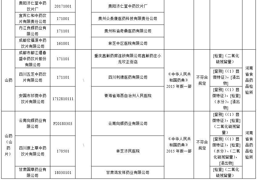 經河南省食品藥品檢驗所檢驗,標示為安國市祁澳中藥飲片有限公司、成都市都江堰春盛中藥飲片股份有限公司、四川五芝中藥飲片有限公司、四川原上草中藥飲片有限公司、云南向輝藥業有限公司、甘肅國草藥業有限公司生產的6批次山藥不符合規定,不符合規定項目包括顯微特征、水分、浸出物、二氧化硫殘留量。