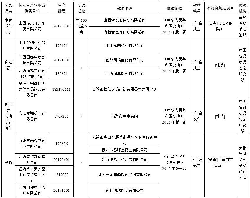 經中國食品藥品檢定研究院檢驗,標示為慶陽益翔藥業有限公司、江西國都中藥飲片有限公司、江西順福堂中藥飲片有限公司、湖北聚瑞中藥飲片有限公司、肇慶市鼎湖區天之健中藥飲片有限公司生產的5批次肉蓯蓉不符合規定,不符合規定項目為性狀。