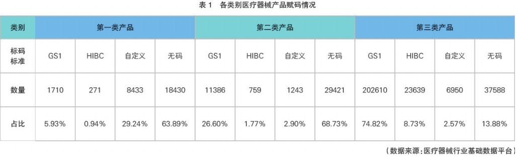 從產品管理類別看,第三類醫療器械賦碼率最高,約占86%,其中使用GS1和HIBC編碼的產品約占83%;第一類、第二類醫療器械的賦碼率較低(見表1)。