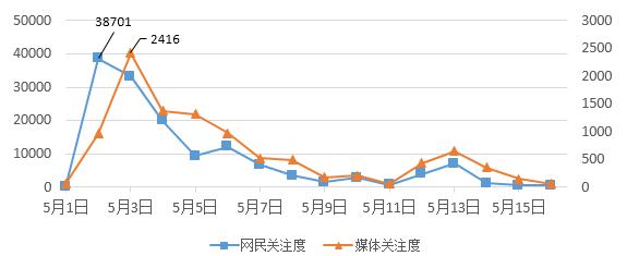 從輿情走勢來看,以5月2日~5月16日為監測時間段,如圖1所示,輿情整體呈現“波浪式”特征,網民關注度遠高于媒體關注度。