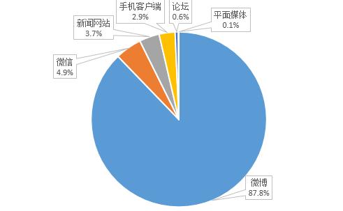以5月2日~5月16日為監測時間段,統計不同媒體平臺報道量。從圖2可以看出,占比較高的信息平臺依次為微博、微信和新聞網站,占比分別為87.8%、4.9%、3.7%。