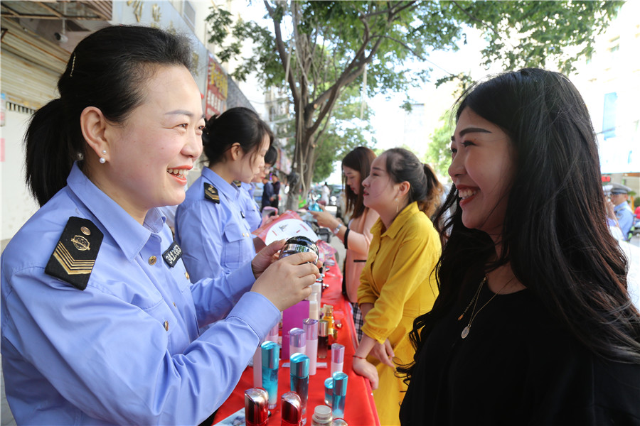 中國食品藥品網訊(通訊員 陳明浩 康夏) 5月20日上午,安徽省阜南縣市場監(jiān)管局啟動以“安全用妝,點靚生活”為主題的2019年全國化妝品安全科普宣傳周活動。圖為該局執(zhí)法人員向公眾科普化妝品功效知識,普及合格化妝品基本要求和選購化妝品注意事項,提升鑒別假冒偽劣化妝品能力,增強消費者安全用妝意識。