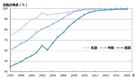 圖11 1996—2018年不同地區住院分娩率變化趨勢
