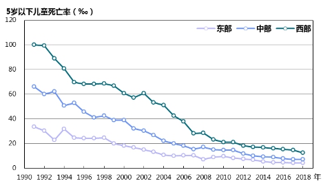 地區差距持續縮小。2018年東、中、西部地區5歲以下兒童死亡率分別為4.2‰、7.2‰和12.7‰,較1991年分別下降了87.5%、89.1%和87.3%。東、西部5歲以下兒童死亡率差值由1991年的66.5‰縮小到2018年的8.5‰(圖6)。