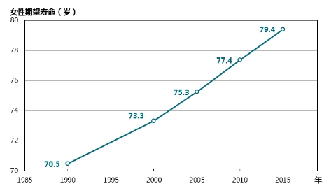 2015年,中國女性期望壽命為79.4歲,比1990年延長了8.9歲(圖1)。
