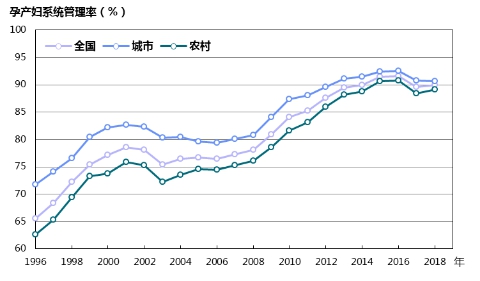 加強孕產婦系統管理。逐步建立起了系統規范的孕產婦管理制度和服務模式,有效保障了孕產婦和新生兒健康。孕產婦系統管理率持續提高,從1996年的65.5%上升到2018年的89.9%(圖13)。