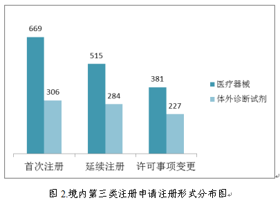 從注冊(cè)形式看,首次注冊(cè)975項(xiàng),占全部境內(nèi)第三類醫(yī)療器械注冊(cè)申請(qǐng)數(shù)量的41.0%;延續(xù)注冊(cè)799項(xiàng),占全部境內(nèi)第三類醫(yī)療器械注冊(cè)申請(qǐng)數(shù)量的33.5%;許可事項(xiàng)變更608項(xiàng),占全部境內(nèi)第三類醫(yī)療器械注冊(cè)申請(qǐng)數(shù)量的25.5%。注冊(cè)形式分布情況見圖2。