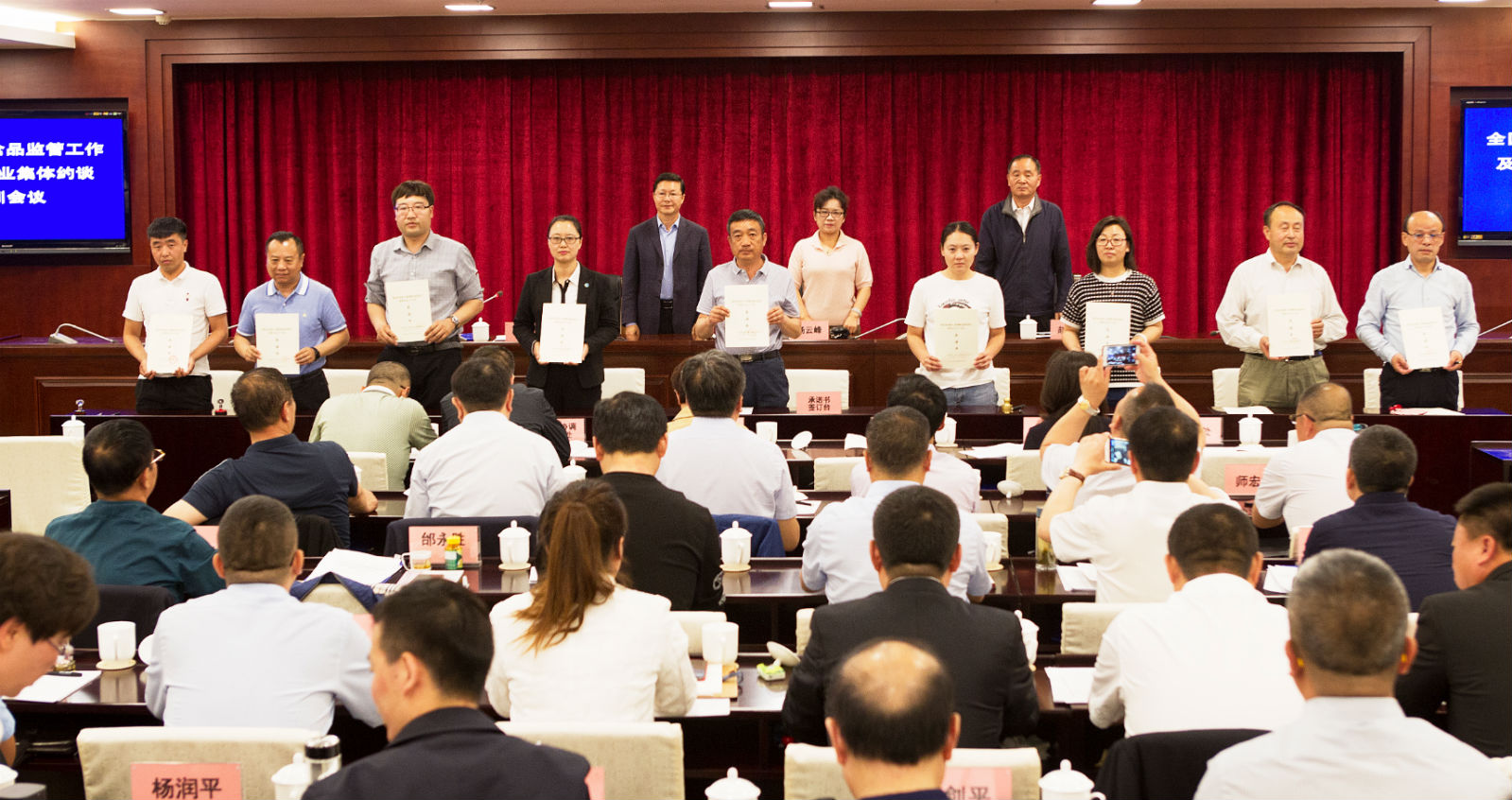 圖為內蒙古自治區市場監督管理局召開特殊食品監管工作及生產企業集體約談培訓會上 企業代表簽訂承諾書后合影。楊燕/攝