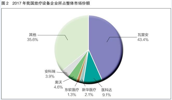 瓦里安醫療設備(中國)有限公司是我國醫用直線加速器以及質子重離子設備領域的重點企業,在我國放療設備整體市場中占有較高的比重。2017年,我國放療設備行業中瓦里安的市場份額為43.4%,醫科達為9.1%,奧沃為4.6%,安科瑞為3.9%,新華醫療為2.1%,東軟醫療為1.3%,其他為35.6%(見圖2)。