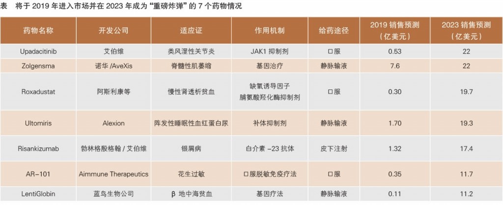 科睿唯安的Cortellis團隊日前發布報告,預測2019年度最值得關注的藥物有7個(見表),它們上市后5年內的銷售額有望達到“重磅炸彈”級別(達到或超過10億美元)。